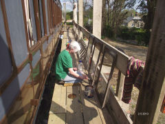 Millpool has waited patiently for work until September 2014 when John began the paint scraping.This is going well - as I write on the 6th January most of the paint has been scraped away and much has been sanded. A bridge, platform and polytunnel have gone up so that work can begin on the outside.